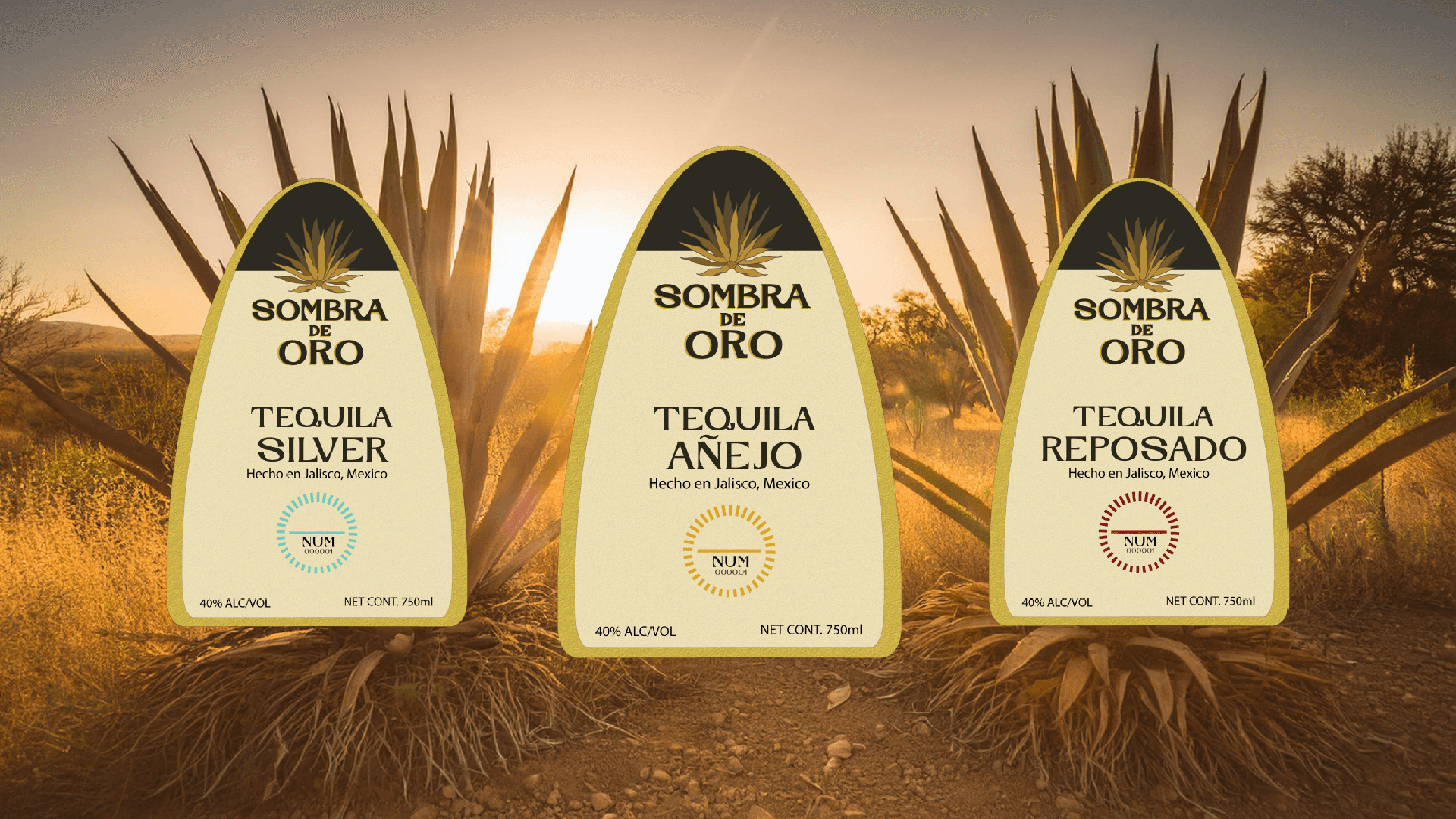 The label system is built around a logo inspired by the agave plant and developed into three distinct label sets. Each set includes a front and back label with subtle color variations to differentiate Silver, Añejo, and Reposado tequila while maintaining a cohesive visual identity across the brand.